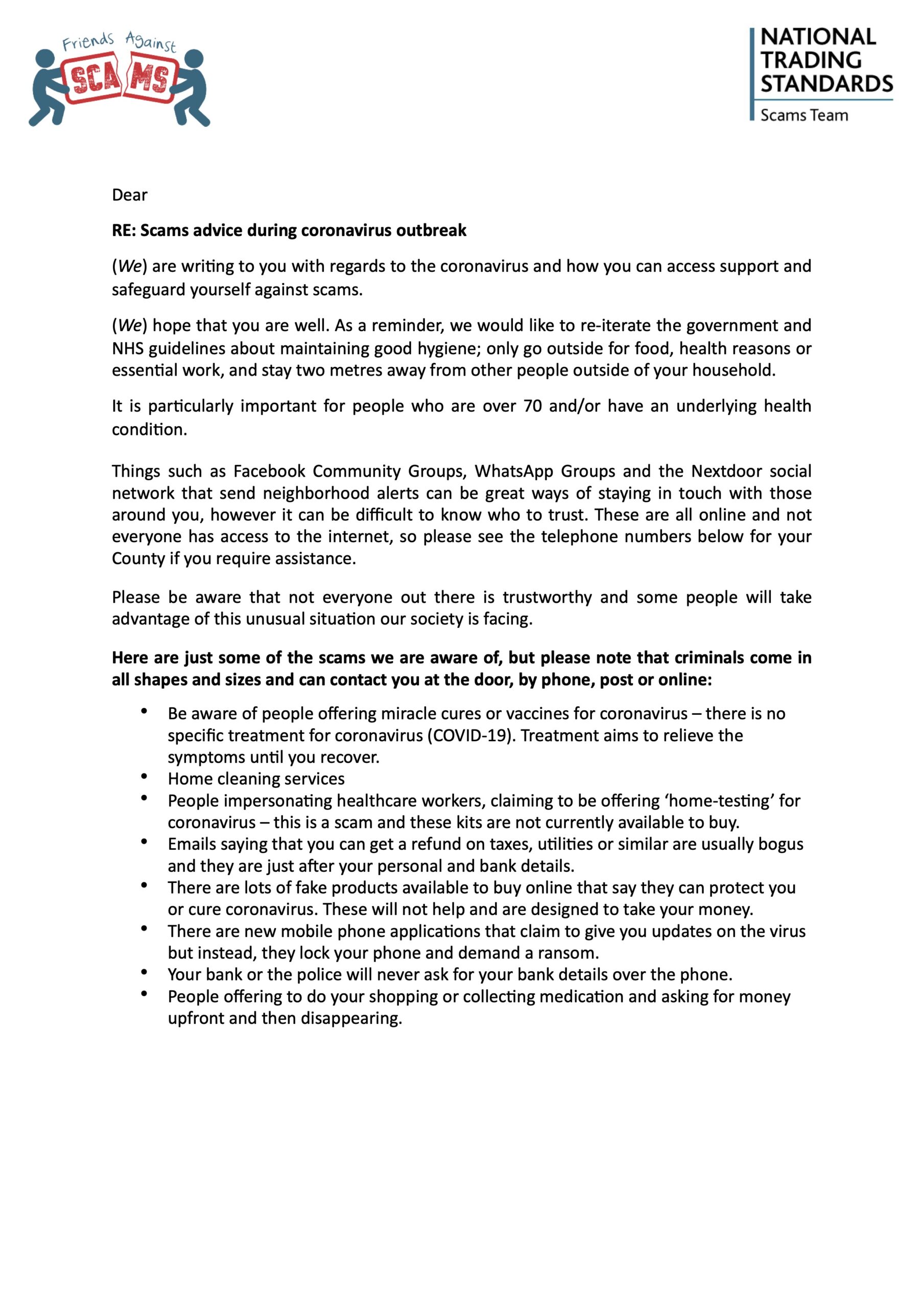 Coronavirus scams awareness letter
